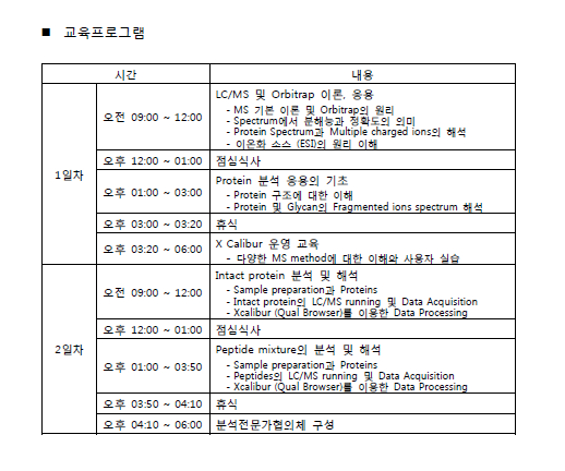 질량분석 실무자를 대상으로 분석센터 내 공동활용서비스를 효율적으로 진행하기 위하여 질량분석기 사용 교육을 진행하고자 하오니 많은 관심과 참여 부탁드립니다.